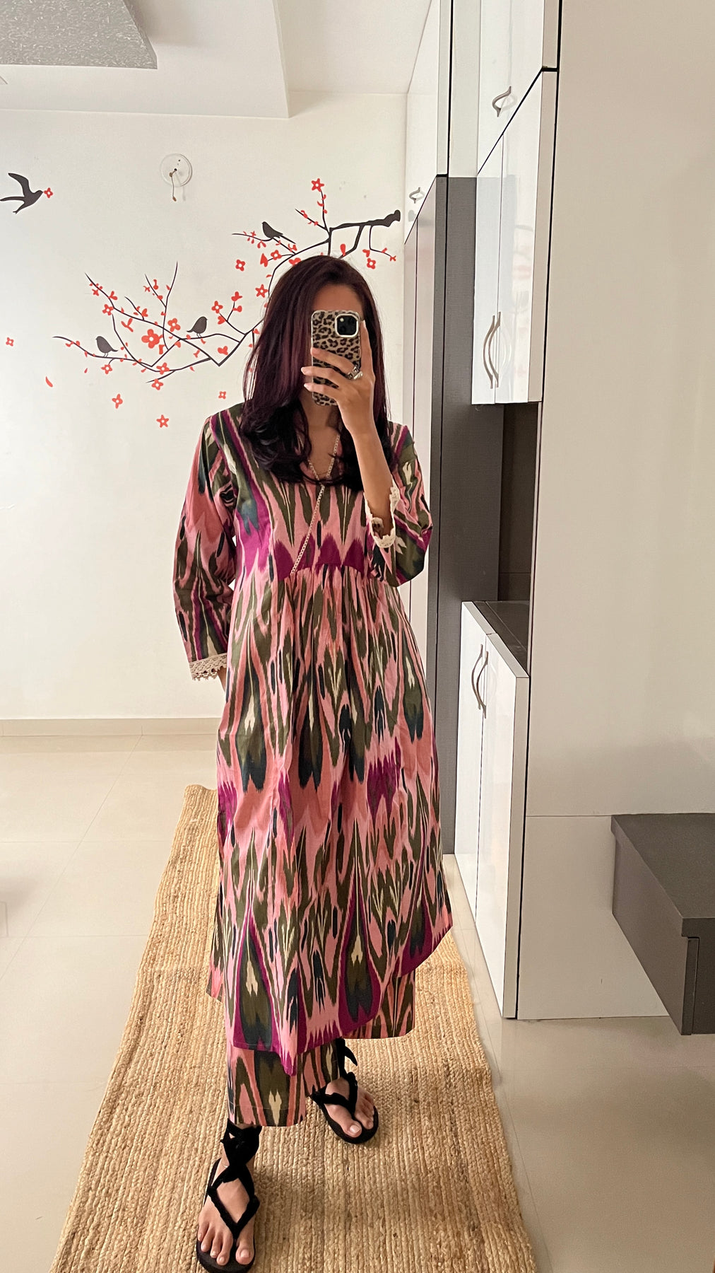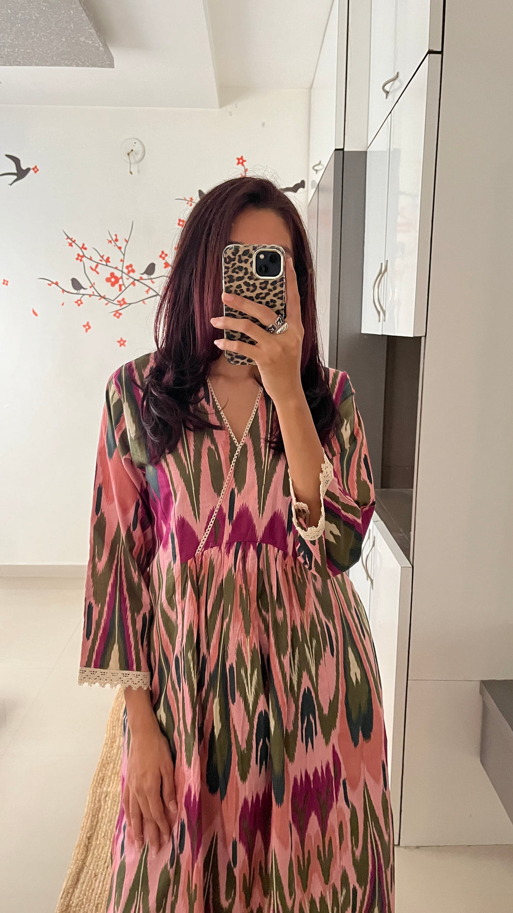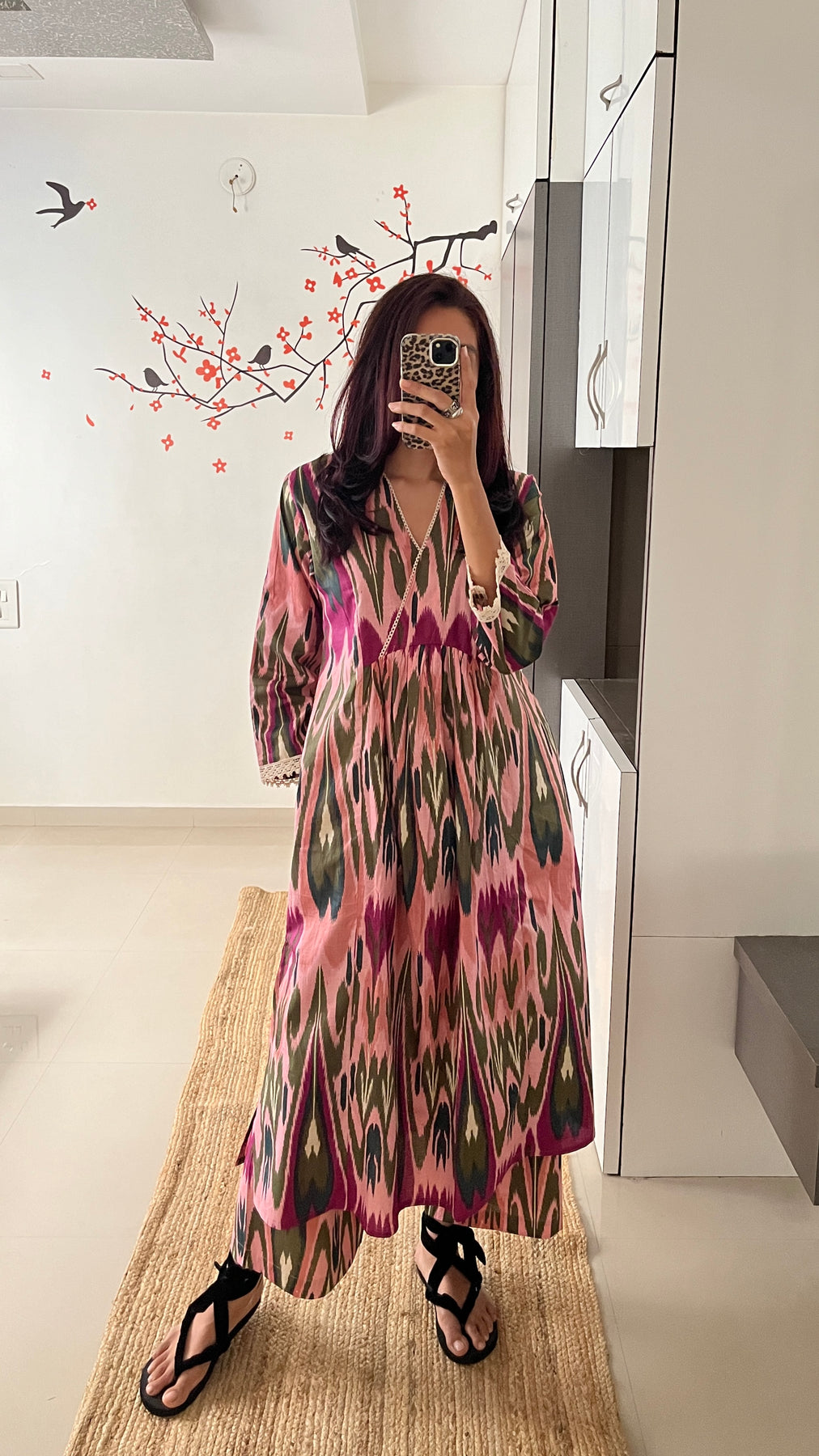 Natural-dyed colours might bleed during the first few washes or rub against the skin & other light-coloured garments. In the artful process of hand block-printing, embroidery work and stitching, variations are likely to come into existence. These irregularities are the hallmark of all handmade products and give each style a unique identity.
