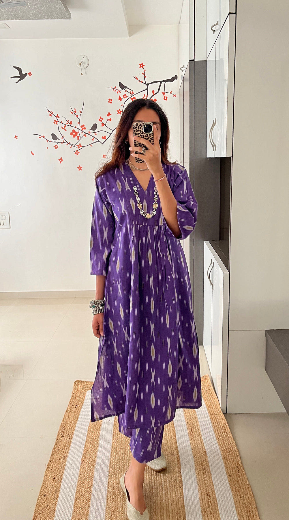 Natural-dyed colours might bleed during the first few washes or rub against the skin & other light-coloured garments. In the artful process of hand block-printing, embroidery work and stitching, variations are likely to come into existence. These irregularities are the hallmark of all handmade products and give each style a unique identity.