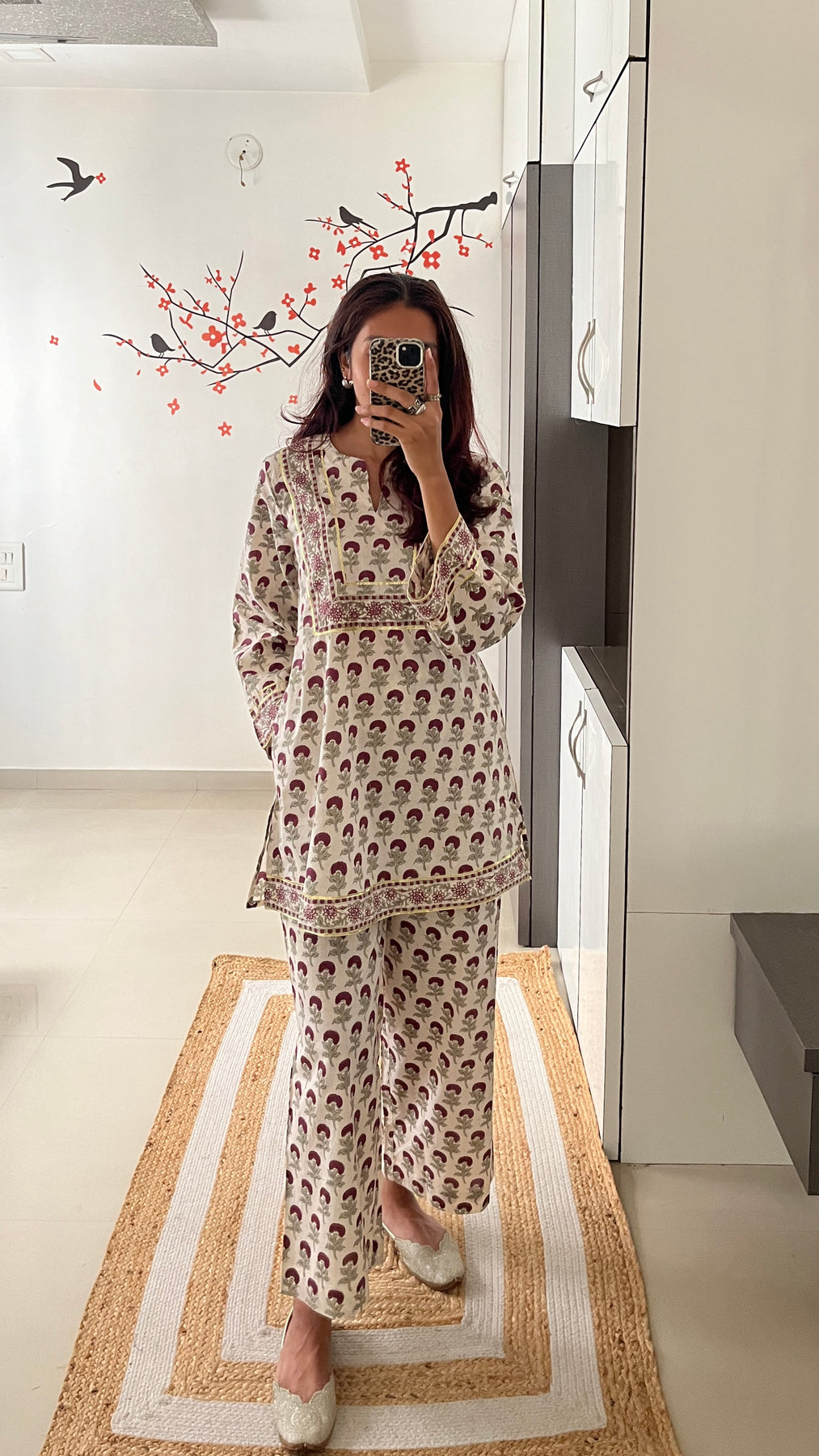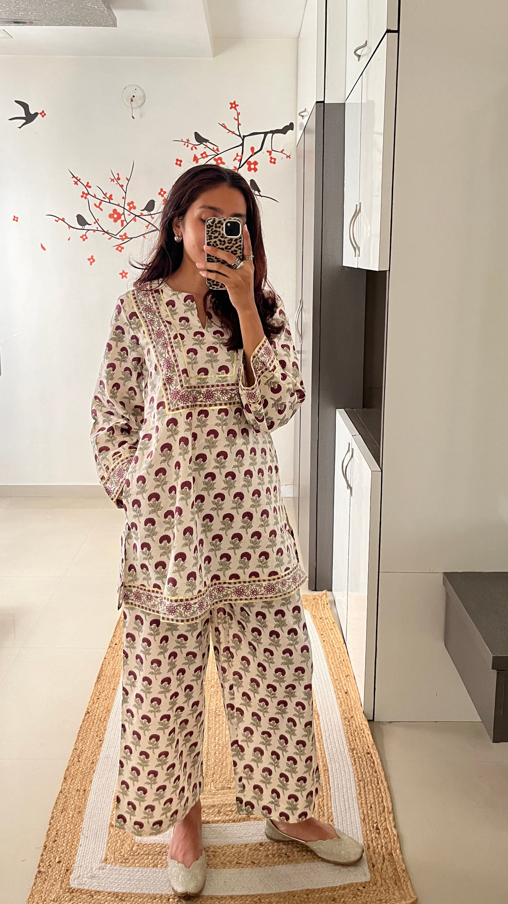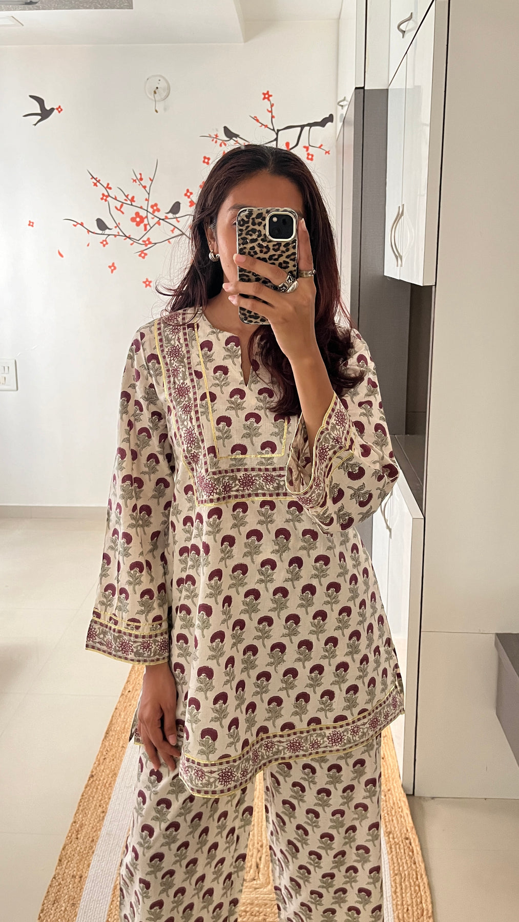 Natural-dyed colours might bleed during the first few washes or rub against the skin & other light-coloured garments. In the artful process of hand block-printing, embroidery work and stitching, variations are likely to come into existence. These irregularities are the hallmark of all handmade products and give each style a unique identity.