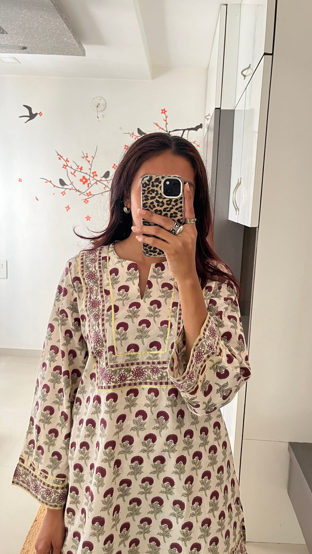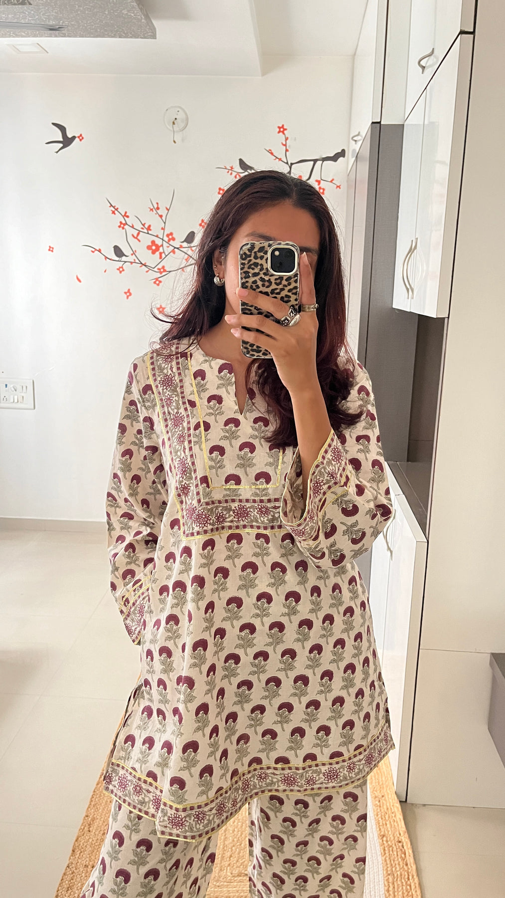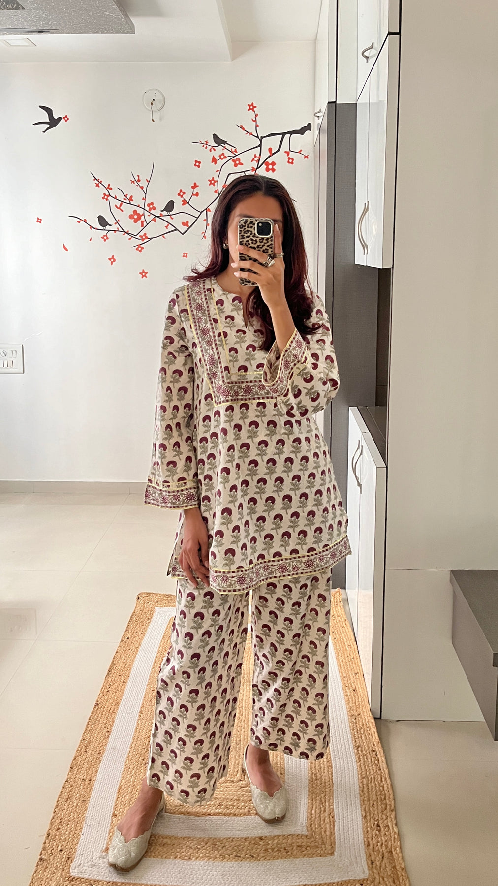 Natural-dyed colours might bleed during the first few washes or rub against the skin & other light-coloured garments. In the artful process of hand block-printing, embroidery work and stitching, variations are likely to come into existence. These irregularities are the hallmark of all handmade products and give each style a unique identity.